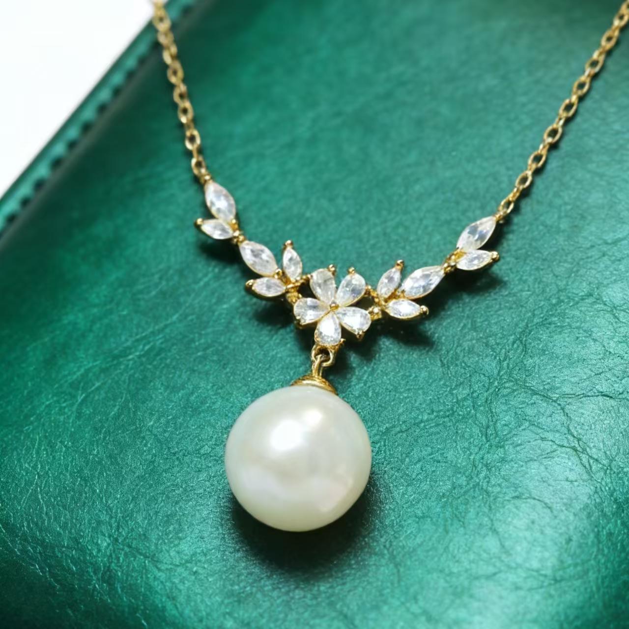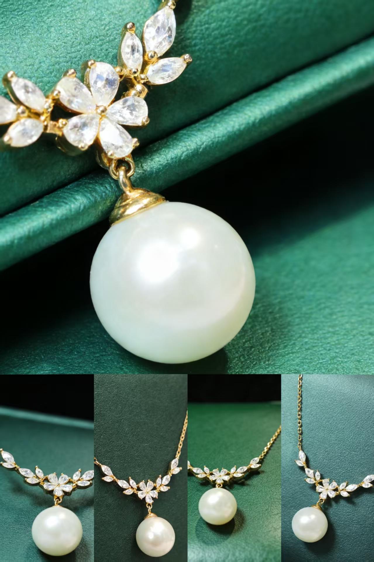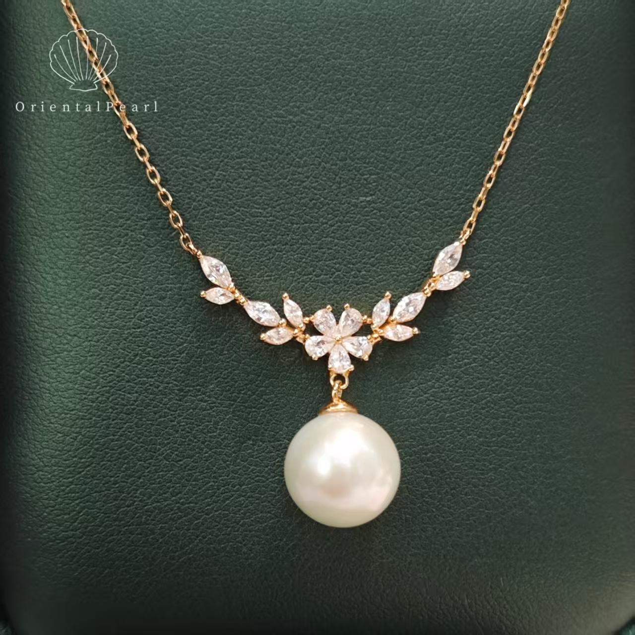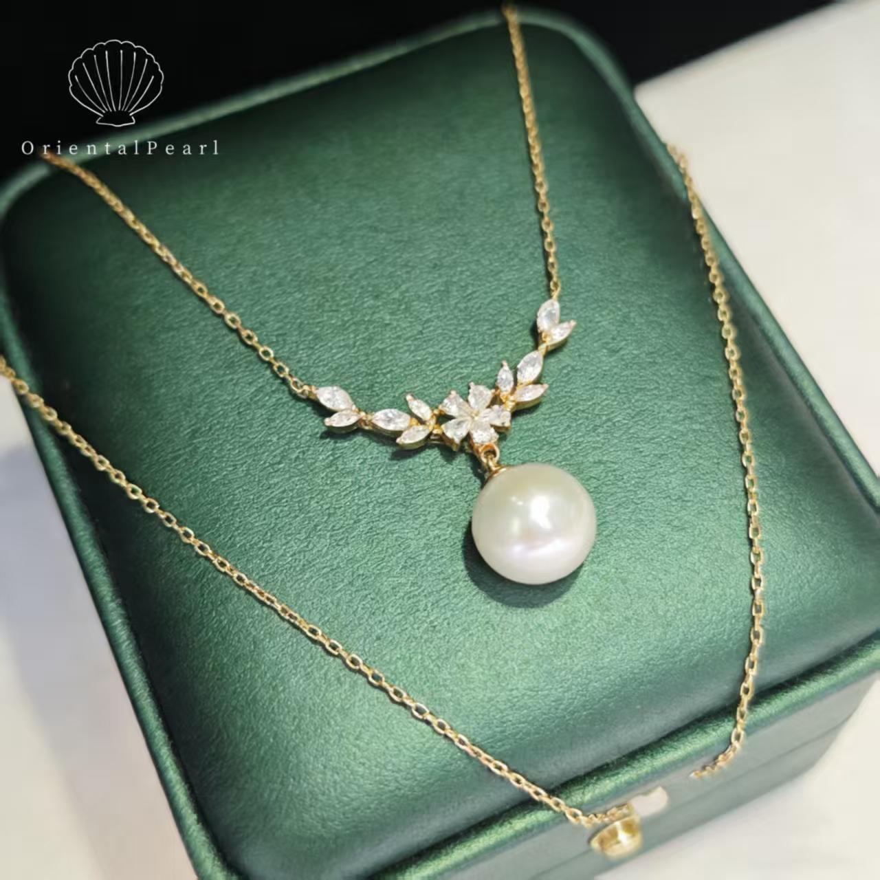 NC11-10mm-11mm Big Size Round White Pearl Necklace with S925 Accessory in Gold Flower Setting Genuine Natural Freshwater Pearl Pendant Necklace with Sterling Silver Chain Bling Sparkling Shiny Gift