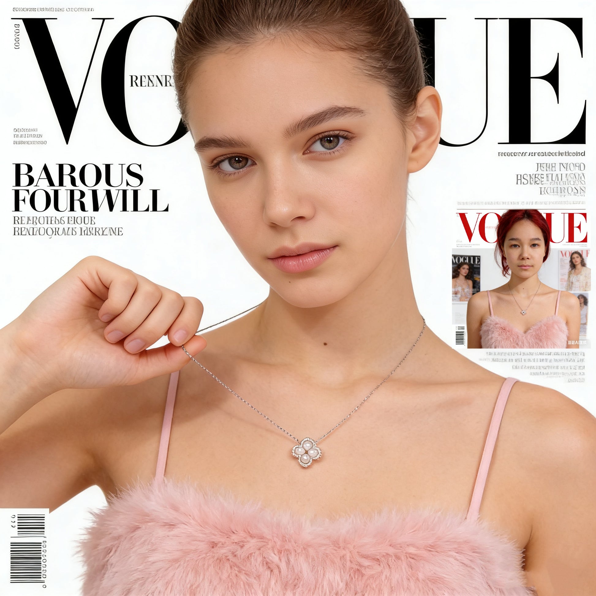 NC24-Four-leaf Clover Pearl Necklace Lucky Clover Design Pearls Pendant White Round baby Pearls with Clear Beads Decoration S925 Sterling Silver Chain Pearl Necklace Perfect Birthday Gift